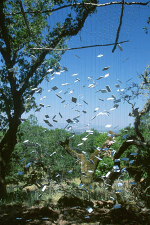 Laurel prunings, stainless steel cables, blue balsa wood platelets suspended on blue-green monofilament line and anchored below grade to steel mesh. Paradice Ridge Sculpture Grove, Santa Rosa, CA.