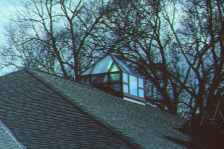 In the daytime, sunlight causes brilliant splashes of color on & through windows. Beautiful subtle, muted colors eminate from inside building at night. Spectral array over glass surface caused by interior light shining through Spectr@Litetm IGU Eastwood Branch, Kalamazoo Library System. | ||