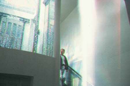 Glass Elevator enclosure at the topmost floor of the Gallery of Modern Art, Glasgow, Scotland. Light from surrounding windows and skylight above, is directed by mirrors mounted to enhance the spectral arrays cast on the walls of the elevator waiting area and adjoining spaces. The doors of the elevator (slide 8) move with the elevator from floor to floor, bringing the spectra down to lower floors as it travels. | ||
