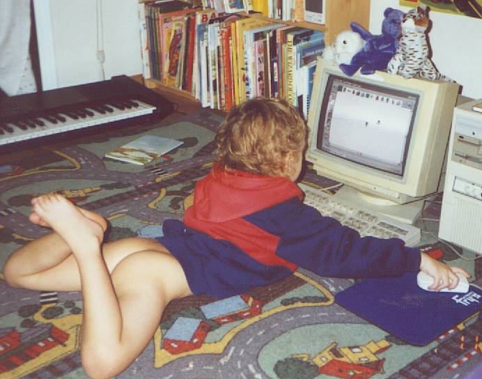 Arthur inherited Sam's old P100 system (after having inherited his old 386 system some years before that :-)), but he doesn't actually use it all that much. Most of his computer time is spent on Sam's computer, among other things helping to test the games Sam programs and also programming some of his own -- this 1997 picture shows three-year-old Arthur (where has the time gone?) programming a Star Wars game, dressed in a typical Arthur outfit. One type of game programming (though not the only kind) Arthur and Sam have done a lot of recently is to program "puzzle sets" for the "MESH game engine" -- if you click that link you can see some mentions of their names and descriptions of their work in the "EXTRA PUZZLE SETS" section near the bottom of that page.