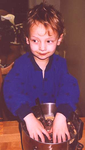 Arthur and Sam love to make and decorate cookies, especially gingerbread and sugar cookies. Here you see Arthur putting chocolate chips into a bowl of cookie dough. (And somehow some dough has gotten smeared around his mouth as well ... hmm, how did that happen? :-))