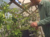 Jon picks purple peppers in the greenhouse (10/18/1999). |