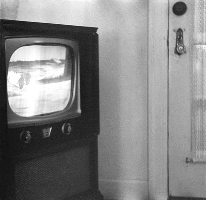 | The TV April 21. 1955. Photographer: Will. 35mm Kodak Tri-X negative. The Pennas got TV in 1953, in the form of this 21-inch Motorola. Mother found some fault with the mahoganny doors, and fought with the store until they either replaced or refinished them. That looks like a Donald Duck cartoon, so we must be watching Disneyland. As you can see from the ghosts, we had terrible TV reception from San Francisco stations because of the hills. Stockton's KOVR, channel 13, had its transmitter on Mt. Diablo, and came in much better. When all the Sacramento stations moved to a big tower in the delta, that's all we watched. Click here to see a typical viewer. The round thing on the front door is the doorbell which, if you twisted it with sufficient force, produced a truly ear-shattering jangle. I liked to start off easy and see how loud I could go before getting yelled at. This is a "found" picture, previously unprinted because of underexposure and partial fogging from being at the head of the roll. |