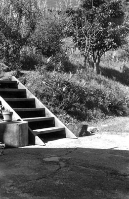 | The Back Steps Spring 1957. Photographer: Will. 35mm Kodak Tri-X. These are the "new" steps, part of a project which Father eventually extended all the way up the hill to the garage. Several years later, he built a deck over the old concrete patio, and I rather missed all its characterful cracks, patches and mossy spots. The hillside above the lawn hasn't yet had its spring weeding, but already you can see some of the iris that filled it. The little path leading off from the top of the steps is "The Cowboy Trail" that wound all around the slope, ending at the the stairs running up from the far side of the lawn past the citrus and walnut trees. The little apple tree hasn't begun to leaf yet, but the loquat in the upper right was green year-round. We had three of them; the fruit, with its gigantic, slick-skinned pits, was sweet and exotically flavorful, but we never did anything with it except pull it off the trees and devour it on the spot. |