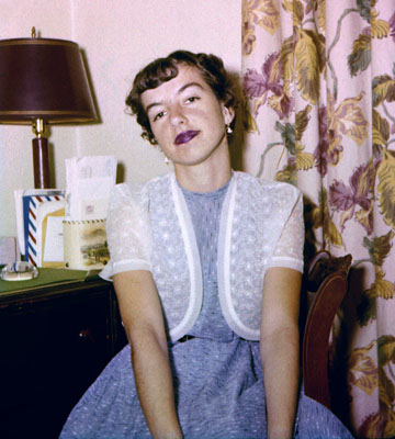 | She's So Blasé c1955. Photographer: Will. 35mm Ektachrome slide. Original was severely overexposed, now also faded to red. I don't know if the lipstick was really that color. UPDATE: Rose reports that her lipstick was probably Revlon's "Orchids to You." |