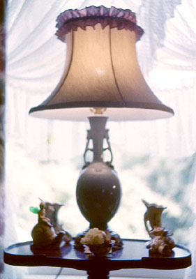 This shot shows one of my all-time favorite doo-dads, there on the left, the fairy riding a snail. Its bright green celluloid wings were an irresistible target for my prying fingers, which undoubtedly contributed to its eventual demise; I managed to finally pry at least one of them off. It apparently got sent to a thrift store or wound up in the trash. I'd kill to have it now. |