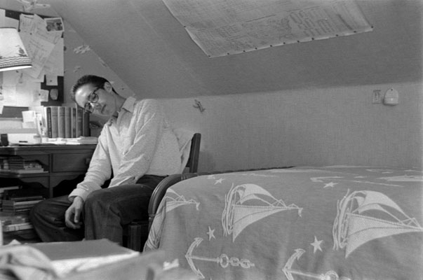 | Boys Room in Black and White May 18, 1955. Photographer: Will (self-timer). 35mm Kodak Tri-X negative. Same roll as the Will and Missie on lawn pictures. Note the holy water font on the wall at right. I think the chart is the Periodic Table. The out-of-focus junk in the foreground is probably stuff on my "desk." |