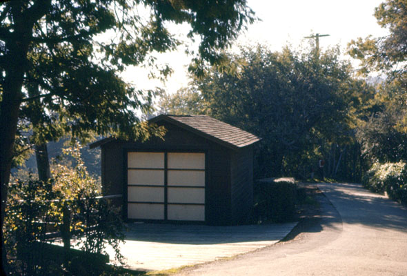 | The Garage c.1956. Photographer: Will. 35mm Ektachrome slide. Its tall, spindly-looking supports inspired numerous nightmares in which I envisioned the driveway collapsing under the weight of the Hudson. Down Walnut Ave., you can see our local fire alarm box, highlighted by the distinctive silver and red paint striped around the telephone pole. Later, I used that color scheme when I turned some of the garden faucets into fire hydrants for the Penton Fire Department. |