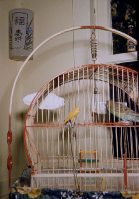 | George IV November 1956. Photographer: Will. 35mm Kodachrome slide. I can't remember the exact sequence of disasters and other mishaps responsible for the tragically brief reigns of the three previous Georges, but one died, one flew away, and another, a foundling, was reclaimed by its owner. The last George, however, was without question the best. Though extremely affectionate, we kept him carefully caged, lest we suffer another bird-brained escape. An excellent talker, he was able to enunciate "George" quite clearly. Apparently the "g" sound is usually difficult for parakeets. He also had an abnormally prolific beak. We'd have to trim it with a nail clippers periodically, and on one such occasion, went too far, and he nearly bled to death. I spent an agonizing week or so worried sick over him. Click here to see him close-up. |