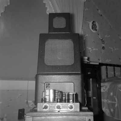 | Will's Hi-Fi c.1955. Photographer: Will. 2-1/4 square Kodak negative. The Webcor portable phono under the two speakers was always jokingly referred to as belonging to me, by virtue of the fact that back in 1948, when I was 2, it was won in a St. Patrick's church raffle with a ticket someone had written my name on. That's my bed and nightstand to the right. Click here to check out the amplifier. |