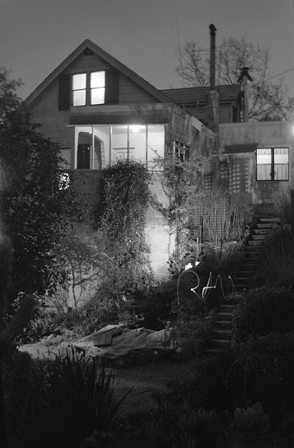 | Our House at Night c.1962. Photographer: Paul. 116 (2-1/2 x 4-1/4) Kodak negative. Time exposure. You might need to scroll down to get this all in. So it's the wrong decade, but it's the oldest (if not only) shot of the house at night. The lighting is not completely accurate, as I set up a couple extra lamps, one coming from the left aimed toward the fish pond, and another behind the boxwood bush aimed up at the front porch. The squiggle is from me writing out "PAUL" with a little flashlight. All that greenery cascading down the front porch is the honeysuckle vine. This must be in winter, judging from the burlap sacks spread out over the lantana to keep it the frost from killing it. I'm not sure where the old folding camera I took this shot came from. It's not the same one used for the 116-format negatives we have from the 1930s and 40s. I liked fooling around with it because it could take time exposures. Here, I'd set it up in the cactus garden; you can see a couple branches of the big spiny one along the lower left edge. |