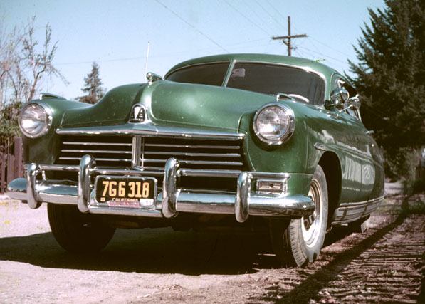 | The Hudson c.1954. Photographer: Will. 2-1/4 square Ektachrome transparency. On Center Way, Guernewood Park, in front of the River House. At this point, the Hudson was 6 years old. That's a spotlight mounted by the driver side window, next to the rear-view mirror. I don't remember it ever being used, but I liked to play with it. Click here to see Father piloting the Hudson. |