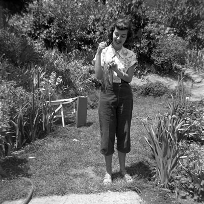 | Rosemary on the Lawn c.1952. Photographer unknown. 2-1/4 square Kodak negative. Where those fish came from, or why they were deemed of sufficient importance to pose with, I don't know. There's another shot with me holding the things. In the lower right quarter of this picture, behind the tips of the upward-sprouting gladiolus, you can pick out some roundish blobs coming from a rather strange plant to find in a flower garden. It's the leek. Each year it would sprout up there, flower, go to seed, then die back down. I don't remember anyone ever digging one up and actually cooking with it. Back then, of course, I never questioned such matters. Things were as they were. |