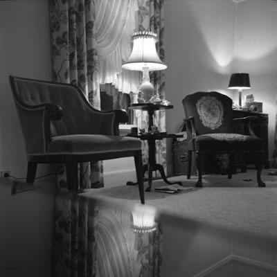 | The Living Room February 10, 1955. Photographer: Will. 2-1/4 square Kodak Verichrome Pan negative, available light. The reflection at the bottom is from the late, lamented cocktail table. Its main purpose, from my point of view, was to pile stuff on and also to provide a perfectly smooth, even surface when I wanted to draw or color. The nearest chair, the lamp on the kidney table and the desk back in the corner are now in my possession. On the floor behind the embroidered chair is the "treasure chest," which Rosemary now has; then it housed the electric train set. I'm afraid the living room is the only well-documented one from this decade. Except for "The Boys Room" and glimpses of the kitchen in "Pets," none of the others seem to have been photographed. |