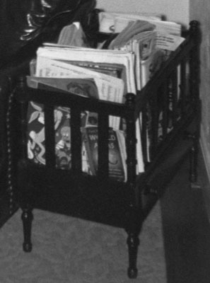Paul is represented by the Bugs Bunny comic book in the front, and possibly also by the World Atlas. You can also see some Sunsets and The Saturday Evening Post, both of which we had long-term subscriptions to. The National Geographics are probably obscured by the taller periodicals, and there could be a Coronet or two hidden in there. I don't recall our being a Life Magazine family, although there were stacks of 1940s-vintage ones gathering dust up in the attic. |