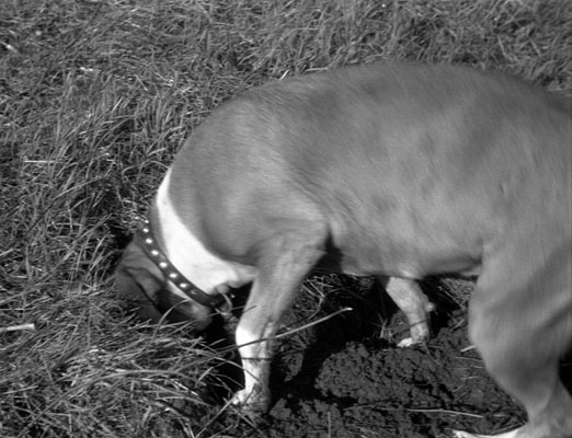 | Digging Dog Spring 1956. Photographer: Will. 35mm Kodak Panatomic-X negative. Part beagle and part hound of some sort, Missie was hard-wired to track and hunt. She wasn't a killer, but she could certainly find anything, including us. We'd take her along on lengthy hikes up in the hills of Larkspur or the Russian river, and she'd disappear for hours chasing deer. No matter where or how far we'd gotten in the meantime, she'd track us down, and come galloping up, often literally at the point of collapse from exhaustion. Early on, she tangled with a raccoon, leaving the small nick on her hindquarters. For some reason, it took a couple times for her to figure out what was bad about skunks, though. |