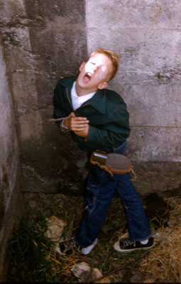 | "Dying at the Alamo" c.1956. Photographer: Will. 35mm Kodachrome slide. A rare shot of me (age 10) with my eye patch, which was supposed to cure my amblyopia, then called "lazy eye." It didn't work, because I cheated all the time. I wanted to be able to read my comic books. Note the nifty canteen, plus the ever-present pair of Keds. Taken somewhere on one of the many hikes Will (who to me was still Bill back then) and I took around Larkspur and the hills above. |