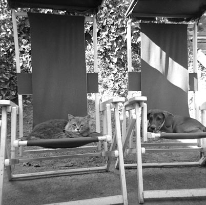 | Pets on Chairs c.1951. Photographer: Rosemary. 2-1/4-square Kodak negative. Tom and Missie. I don't have too many memories of Tom, except that he wasn't around much. Mother would put his dish of food at the top of the basement stairs, and he'd find his way in. Forever after, that step had a permanent fragrant grease stain from slopped-over cat food. It was an occasion when he deigned to visit at other than dinnertime. We must have just recently gotten Missie; she's still almost literally all ears. She was a foundling, rescued from a orphan's life on the beaches of the Russian River by family friend Mrs. Kelly. As a newcomer, she got along OK with veteran Tom. Of course, this is probably because she quickly learned who's boss. Tom took no crap at all from our previous dog, who'd been named Nippy for a reason. In comparison, Missie was a complete pushover. Their expressions here are eloquent testimony to the acknowledged pecking order. Click here for an example of their respectful, if not exactly affectionate, relationship. |