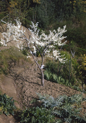 | Father's Orchard c.1956. Photographer: Will. 35mm Ektachrome slide. Besides this plum, Father had an apricot, prune, cherry, a pear, two peaches, two (maybe three) figs, four or five apples (plus a crabapple), an avocado that never produced, a persimmon, a lemon, an indeterminate citrus that finally, in the 1960s, came out as a grapefruit, plus one each almond and walnut. Besides the previously-mentioned loquats, I think I got them all. Produce from these kept Mother hopping, what with canning, and later freezing, some, and making jam and jelly from others, plus the inevitable applesauce. We were never out of dessert. And, of course, during summer you could just go out and forage for yourself. My personal favorite were apricots plucked right off the tree. This is not to mention all the grapevines scattered throughout the yard: Concord, Thompson seedless, tokay and muscat. Father was an irrepressible grafter; each apple tree had up to three or four different varieties growing on it. This Santa Rosa plum, in fact, had a couple other kinds as well. Other plants in this scene: artichokes at the lower right; acanthus lower left; to the right of the plum, iris going down that slope above the lawn. Later, they'd be obscured by the ring of grape vines running all along the crest. |