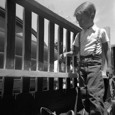 | Paul Up the River c.1952. Photographer: Rosemary. 2-1/4-square Kodak negative. Painting the new fence. If I've gotten the year right, I'm 5 going on 6 here. You can see Father through the pickets on the other side. I can't believe he risked parking the Hudson so close to the flying paint blobs. Apparently, getting photographed in that hat was The Thing To Do. Click here for verification. |