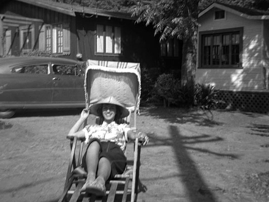 | Rosemary Up the River c.1952. Photographer unknown. 2-1/4-square Kodak negative. The utterly barren yard indicates this must be shortly after we got the place; Father hasn't had a chance to do much gardening yet. Still quite a novelty at this time, Rosemary's Chinese hat figures in some photos as late as 1958. |