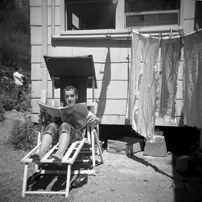 | Rosemary and the Wash c.1956. Photographer: Paul. 2-1/4 square Kodak negative. There seems not to have been an officially-designated term for this area. Its primary usage, besides occasionally providing space for sunbathing, magazine perusal and permanent wave setting, was for drying wash. The main clothesline, running on a pulley from the kitchen window, is out of sight, but you can see its shadow on the wall behind the chair. The one with what appear to be rags hanging on it was sort of an auxiliary affair. For a long time, an old gas range sat out here rusting away. The area under the house was also used to "store" unused stuff for years until it finally got hauled off to the dump. A couple years after this shot, this area became the site of the City of Penton firehouse. In the distance, Will is doing some yard work. Click here to see exactly what. |