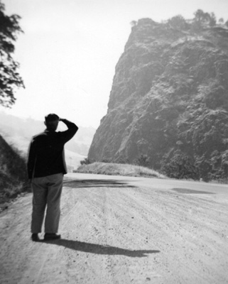 | Standing on the shoulder of Highway 101, Father gazes at Squaw Rock. Photographed by Paul c.1956. | ||||||||
