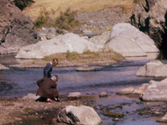 | September 1956. Father and Paul search the riverbed for specimens for Paul's rock collection. Enlarged detail from an Ektachrome slide by Will. | ||||||||