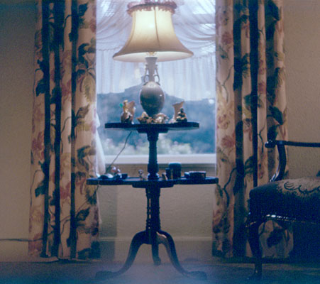 | The Tier Table c.1956. Photographer: Will. 35mm Ektachrome slide, available light. Equally well-known as the "kidney" table for the shape of its tiers, it's here being used to hold, besides the blue lamp, a number of the Penna family tchotchkes and gimcracks that embellished the living room tables and bookshelves. The really good stuff was kept safely locked away in the china cabinets in the dining room, to be seen but not touched. The link below will show some of them closer up, but here I can make out, on the lower shelf, the little ceramic dogs in the center, and on the right, the cloisonné ashtray, cigarette cannister and match barrel. At the right on the upper tier is the brass Buddha incense burner. Regrettably, the lamp now has a different shade. Click here for a closeup. |