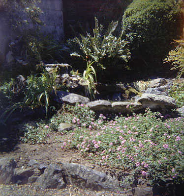 | The Waterfall c.1957. Photographer: Paul. 2-1/4 square Kodacolor negative. Believe me, the waterfall is there and it is running, through the upper left quarter of this picture. The pond itself is behind the horizontal row of rocks in the center. The waterfall was the only feature retained from the original big fish pond. The valve for it was under the boxwood at the upper right. We only ran it occasionally, for a few minutes at most. Mainly this was because it wasn't recirculating, but just fresh water pouring out of the pipe. Also, the pond had no overflow outlet, just a drain at the bottom. Running it without proper authorization was something I could get yelled at about. The lantana with its lavendar blossoms has survived a winter freeze and is making good ground-cover progress. |