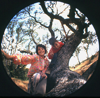 Mary and Dave up a tree. Clever ol' Uncle Paul had gotten himself a fisheye lens attachment.