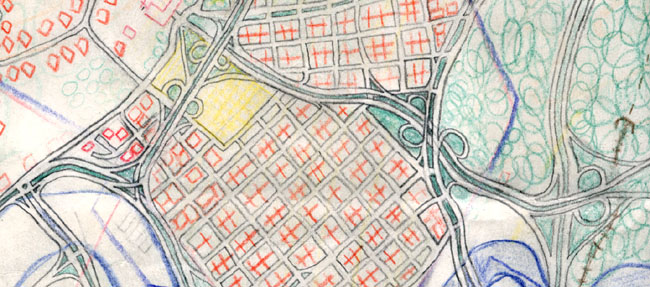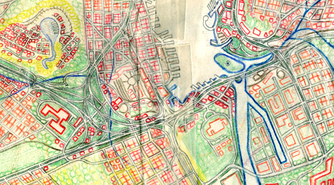 | Fantasy map drawing as a Will and Paul playtime activity goes back to the mid 1950s. Will says he has some of our early efforts, but in the meantime, this example from the 1970s is pretty representative. As with all Penna family activities, the procedure eventually became formalized and thus immutable. Yes, I was still doing this in my twenties, and even getting other people into it. The process, developed by Will, was as follows: on a large sheet of butcher paper, the basic geographical details, shorelines, rivers, streams, hills and mountains, were first sketched in with colored pencils. Then an arbitrary starting date was chosen, generally sometime in the 1800s, and roads, towns and perhaps railroad lines were added. From there, we'd progress decade by decade, enlarging and developing the towns and, of course, adding more roads. As time went on, major existing roads were widened, then made into super-highways and finally, as we got to the present day, I could start designing interchanges and make them into freeways. In the lower left of this one, you'll notice the faint outlines of some wharfs extending into the river. Apparently these had been incompletely erased as part of some urban-renewal project that included the addition of the shoreline freeway. Also, you'll see that all my freeways, as well as divided surface streets, are impeccably landscaped. No doubt this was an homage of sorts to the way Highway 101 through Santa Rosa actually looked before the freeway was built. |