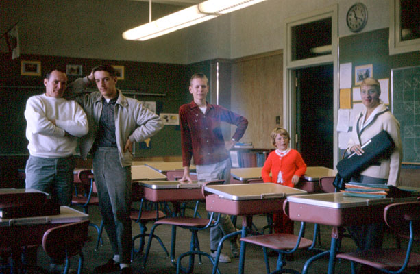 One day when I was a junior or senior at Redwood High, I went back to LCM and paid a visit to my 8th grade teacher, Roy Gustafson, in our old classroom. He observed that in the intervening years, I'd gained "poise," which I presume is what I'm demonstrating here. Also pictured: my boyhood chum David, plus Roy's daughter and wife. See my report card and class photo. |