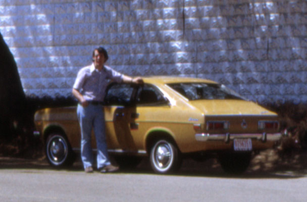1972 Datsun 1200. Still has the paper plates. Doug seemed less than sanguine about my driving adventures, and drew this cartoon as illustration. |
