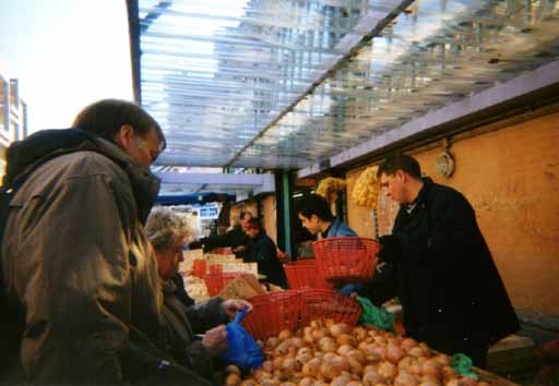 guillaume shopping for potatoes, onions and garlic at a produce stand in the huge open air market of st. denis. [ 40 ] in the morning i went out for a baguette. i skipped the boulangerie beside our front door and looked further. the streets, so packed with partying people the night before, were full of traffic with a small number of pedestrians. i found a busy bakery just down the street and purchased a fresh baguette. back at the apartment we ate fresh bread with cheese and fruit juice. we packed for a long day. our morning destination was the basilica at saint-denis north of paris, and our afternoon destination was the palace of versailles south of paris. we walked to the metro station at hotel de ville. it was one block closer to our apartment than the st-paul metro station. we rode line one to clemenceau station, changed to line thirteen, and rode to the end in the north parisian suburb of st-denis. just outside the metro station was an empty fountain with workmen tinkering on the tall water spraying apparatus exposed inside an access door in the bronze pedestal. beside the fountain was a city square which was completely filled with flea market stalls and throngs of shoppers. we skirted the edge of the square and looked down the next street to the basilica one block away. a plaster wall was covered with posters announcing an anti-war rally to be held in paris the next day. we decided to check out the flea market a bit before going to the basilica. the crowd seemed like a mix of north african, middle eastern and central asian people. most women wore head scarves. black haired men in leather coats barked from stalls hawking watches, stereos, clothing or vegetables. the market was dense with shoppers. margueritte was in heaven. she dove right in with the other women, sifting through tables piled high with scarves priced at five euros each. i looked about a bit but became bored. she found one stall with a huge scarf selection and said i could go on and look at other stalls and meet her back at this one. i methodically explored the warren of stalls in the square. i found they spilled out in an irregular fashion down a side street. i circled back and checked with margueritte. we agreed to meet at the fountain in twenty minutes. i wandered off through the stalls out of the city square. a half block from the plaza the stalls ran down streets on both sides of a large building and swarmed up the steps of the building. inside the entire ground floor of the building was a maze of stalls, with small variety stores, food booths, fish market stalls, butchers and bakers. teenagers pushed dollies piled high with boxes of fish and produce to resupply busy stalls. i looked out the door of the building and saw the stalls descend down the streets and disappear around the corner. i circled back by the train station through a small mall of shops and waited at the fountain for margueritte. she returned with a new scarf. i took her to the building with the bakeries and butcher shops. we stopped at a produce booth where i bought some garlic and potatoes. then we walked to the basilica.